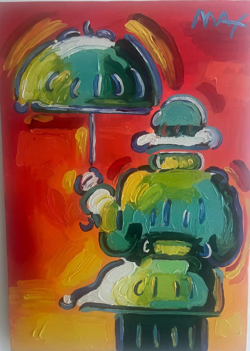 Description: Hand signed on front by Peter Max. Original Acrylic on Canvas.  Year painted 1985.  Artwork is in excellent condition..